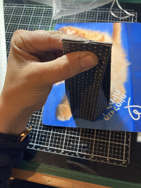 השלב הבא הוא לייצר את הבסיס של הקופסה, נדביק לשונית מול לשונית בשלבים, ונשים לב לשמור על צורת הקופסה ולא למעוך.